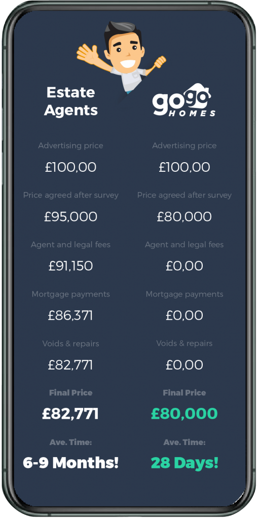 The price you get through Gogohouses for a quick cash sale is probably much higher than you think. Take a look at our comparison table below and you’ll see you can save months of your life, avoid estate agents and still receive a competitive price for your property.